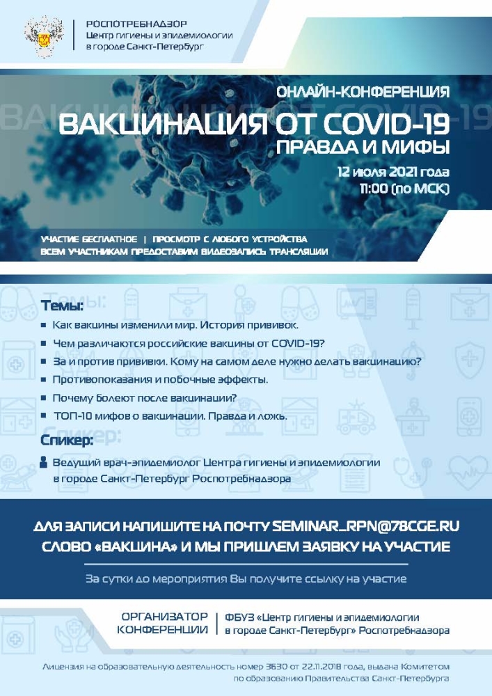 Центр гигиены и эпидемиологии в г. Санкт-Петербурге приглашает принять участие в онлайн-конференции «Вакцинация от COVID -19. Правда и мифы».
