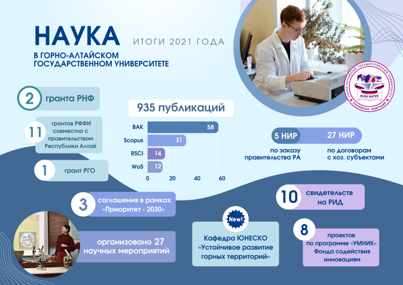 Научно-исследовательская деятельность ученых университета в течение 2021 года осуществлялась в соответствии с приоритетными направлениями научно-технологического развития Российской Федерации и направлениями развития Республики Алтай. В рамках Года науки и технологий проведено более 30 мероприятий, реализовано более 60 научных проектов, активно осуществлялась научно-просветительская деятельность среди молодежи и школьников.