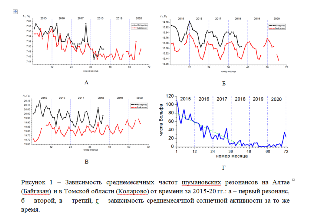 В рамках регионального гранта 20-45-040013 р_а «Исследование вариаций геомагнитного поля и крайненизкочастотного электромагнитного фона на территории Горного Алтая как экологического фактора» подведены итоги мониторинга параметров шумановского резонанса на территории Горного Алтая за 2015-2020 гг. Шумановские резонансы – это своеобразное «эхо гроз», которые постоянно идут в экваториальной части Земли. Возникающие в результате разрядов электромагнитные волны обегают вокруг планеты и усиливают сами себя – в результате возникают резонансы на частотах около 8, 14, 20, 26 Гц. Томскими исследователями показано, что данные резонансы используются организмом человека в качестве естественных «водителей ритма» - при изменении частоты первого резонанса синхронно меняется и частота альфа-ритма электрической активности мозга.