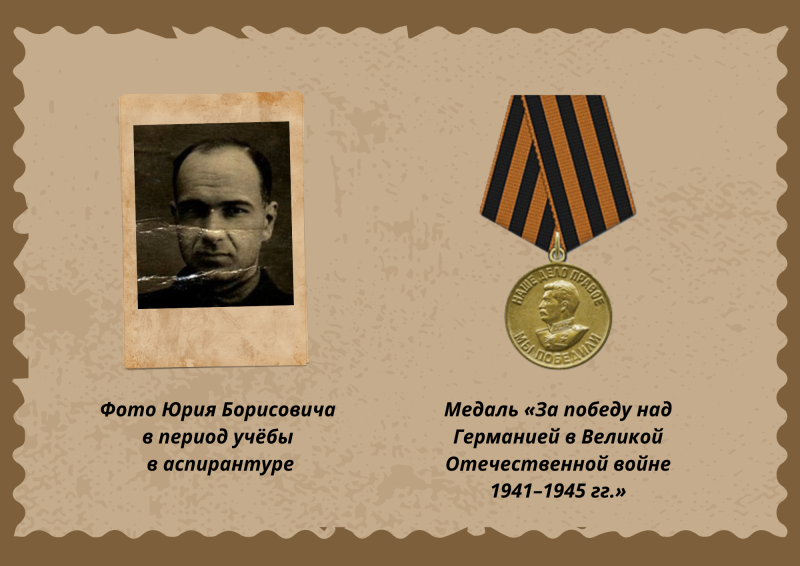 Юрий Борисович родился 10.04.1904 году в Ленинградская обл., Детско-Сельский р-н, д. Липицы (Пушкинский р-н). С 1921 по 1946 год служил в РККА. В 1933 году окончил химический факультет Воронежского государственного университета по специальности «Органическая химия», в 1939 году – аспирантуру. Всю войну местом службы был научно-исследовательский химический институт. За свою деятельность учёного-химика 21.09.1945 был награждён медалью «За победу над Германией в Великой Отечественной войне 1941–1945 гг.». Материалы деятельности Юрия Борисовича в годы войны как и его личное дело в архиве Министерства обороны находятся под грифом «Совершенно секретно», что говорит об актуальности до сего дня его исследований. В запас Ю.Б. Васильев уволился в 1946 году в чине инженер-майора. С 19 июля 1949 года по 16 марта 1951 года – первый директор Горно-Алтайского учительского института.